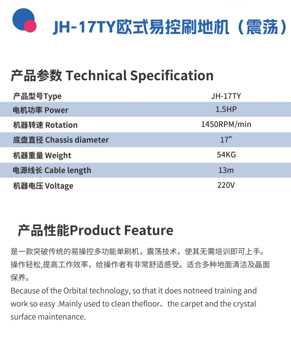 该产品适合用于国际商务酒店石材地面的翻新保养,具体参数为:底盘直径:20寸;机器重量:70KG;电源线长:13m;机器电压:220V;机器转速:175RPM/min;电机功率:2.5HP;具备安全可靠、美观、从容应对多种地面问题等特点。