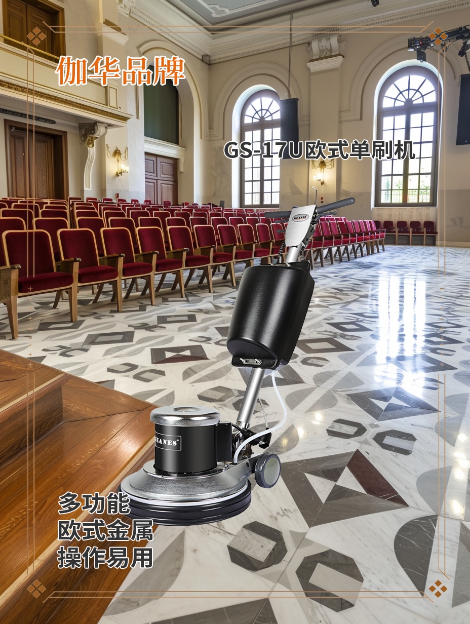通过配备13米长电源线和150RPM稳定转速,GS-17U单刷机提高了清洁半径和工作效率。在酒店各类复杂、多层次石材地面的抛光与护理作业中,设备表现出卓越的耐用性与持久能源,极大降低了维护与使用成本,同时减少了清洁人员的操作难度,显著提升整体石材维护的工作效率。