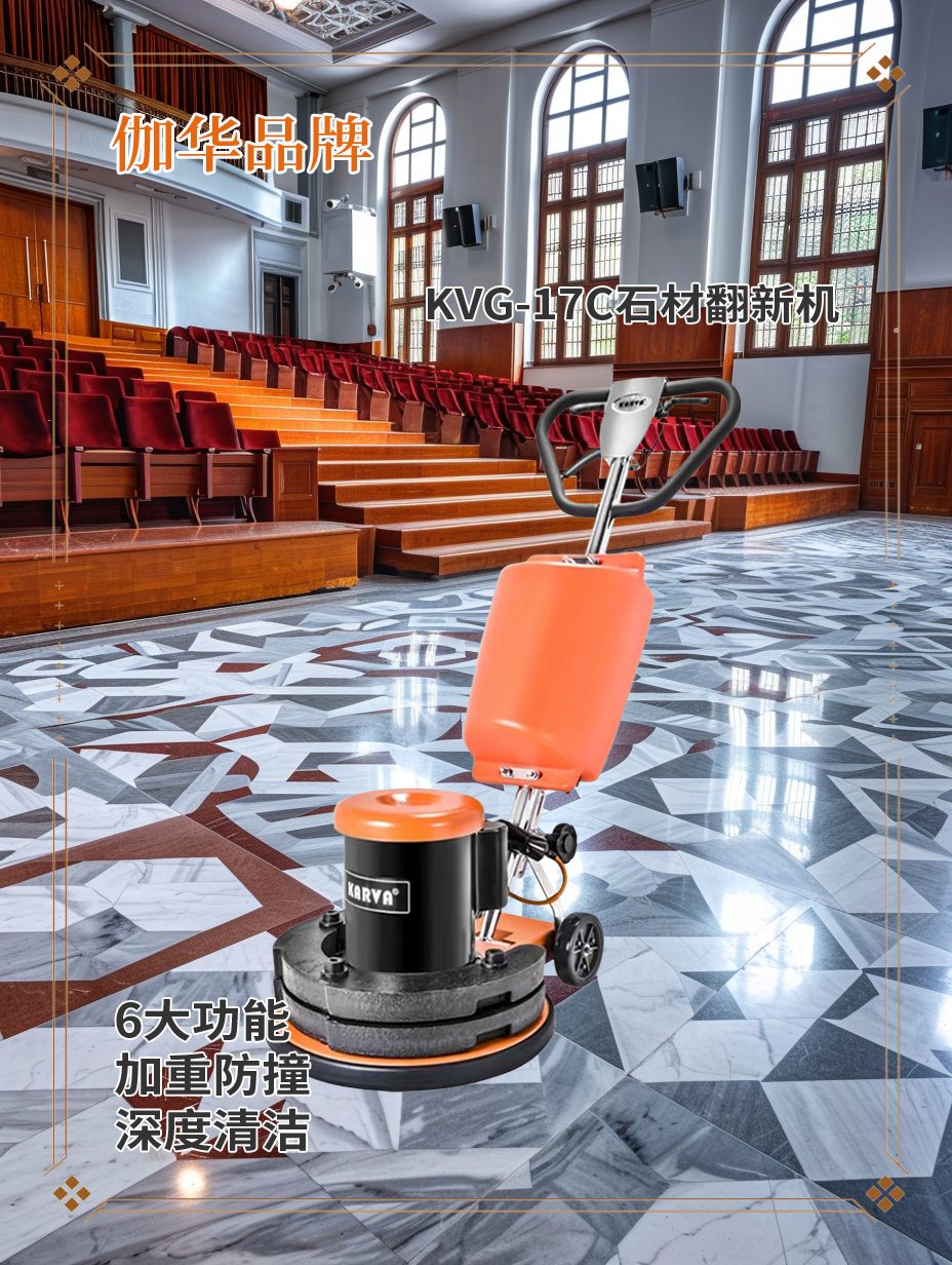 以石材翻新为例,嘉兴的商场、大型写字楼、高级住宅小区及公共建筑对石材表面的镜面光泽度和无痕抛光效果要求极高。伽华KVG-17C的175RPM转速和17寸底盘设计,结合1.5KW强劲电机动力,使其在快速修复和持久耐用之间达成最佳平衡。用户反馈显示,使用该设备后,石材表面的划痕明显减少,光泽度提升显著,极大地节省了人工和时间成本。