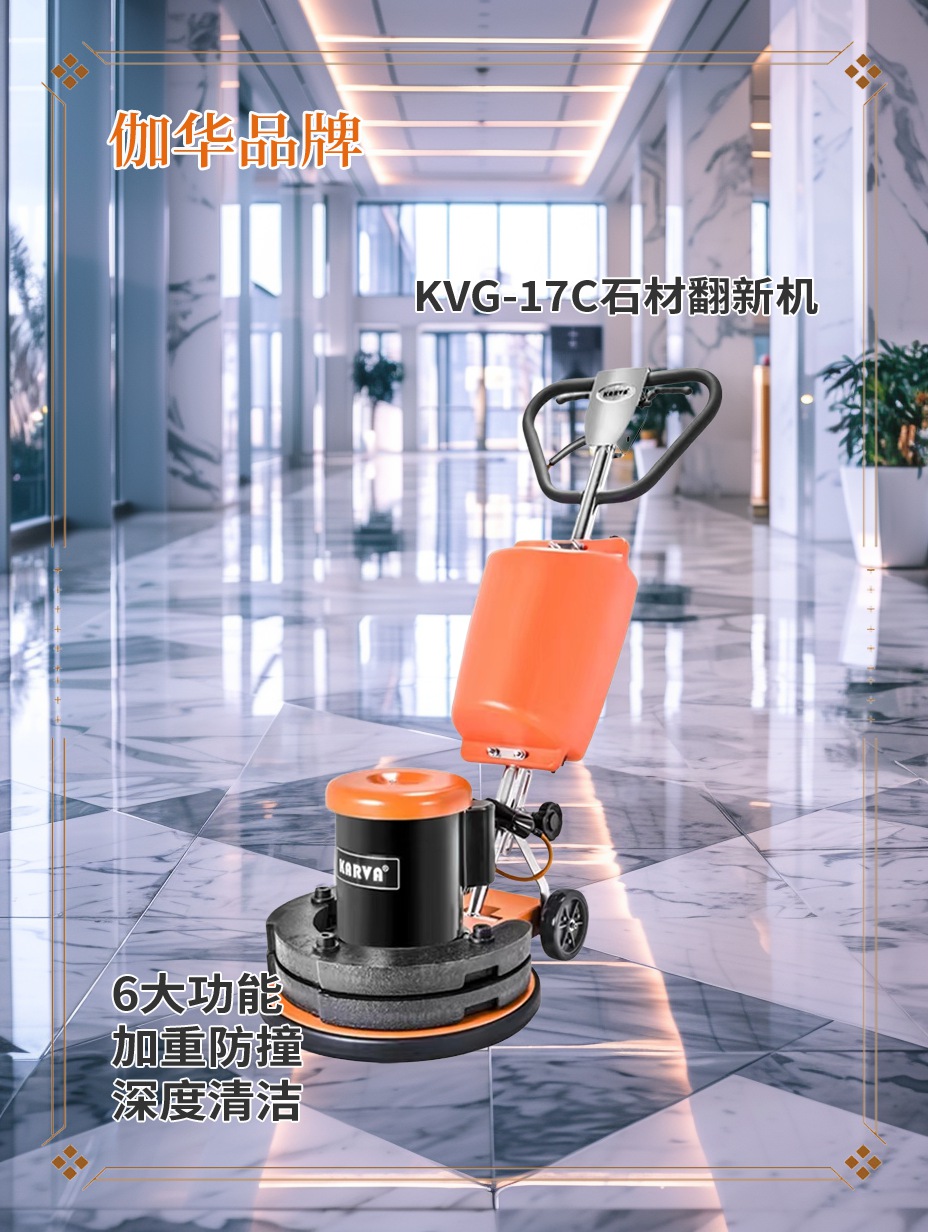 伽华品牌凭借超40年行业经验,深入理解清洁公司在实际使用中的需求和难点。例如频繁更换设备、设备维护成本高、抛光效果不理想等问题,KVG-17C一机多用的设计有效解决。这款机器集清洗地面、地毯洗涤、抛光和翻新打磨于一体,既节省了采购多台机器的成本,也降低了后续维护的复杂性。此外,电机功率达到1500瓦,转速稳定在175RPM/min,为高效清洁和持久光泽提供了有力保障。