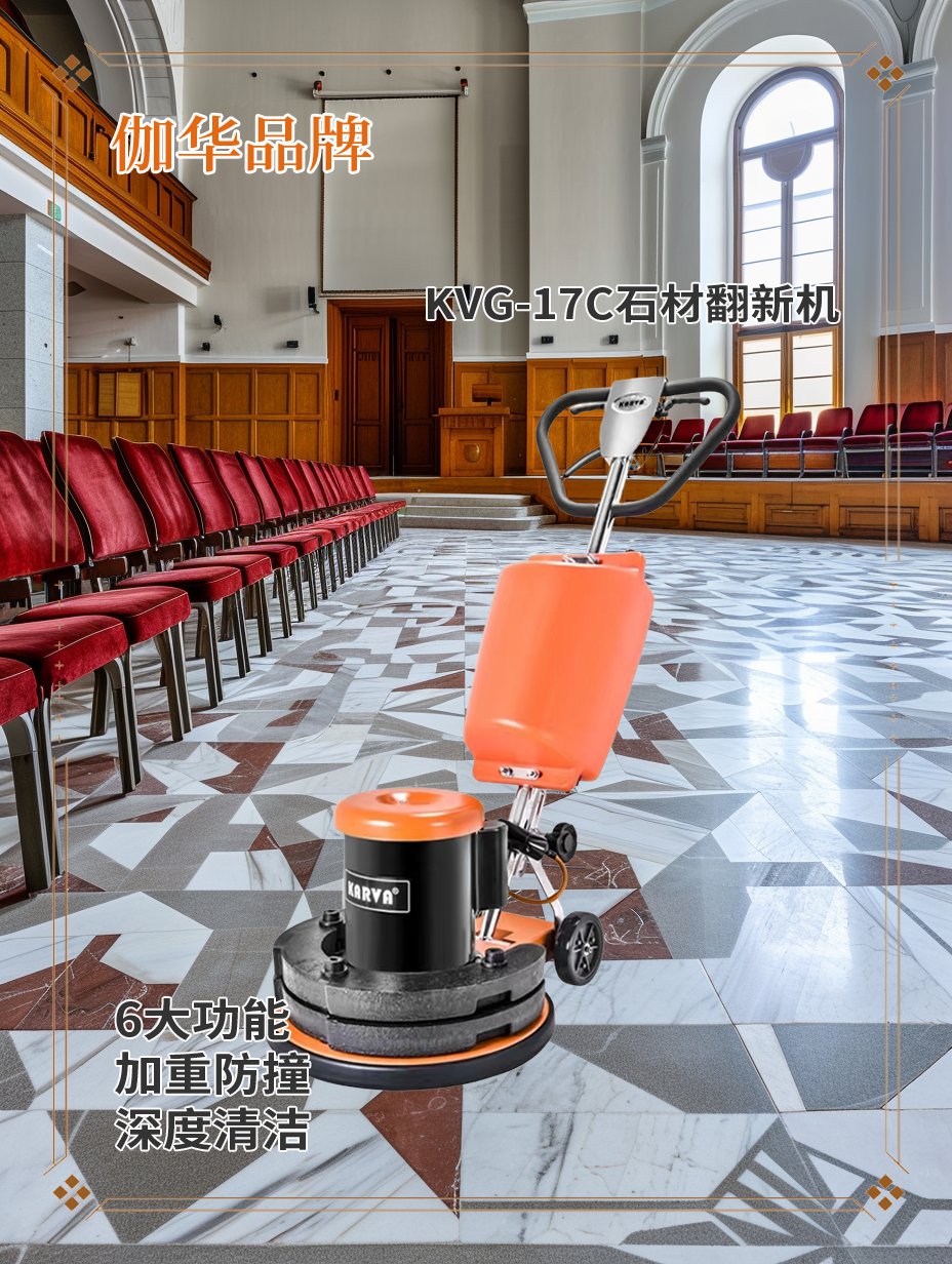 从广泛的使用场景来看,KVG-17C伽华2.0匹石材翻新机适配商场、酒店、写字楼、高级住宅区、机场、火车站及各类公共建筑等多种环境,满足不同场合确切的护理需求。特别是面对复杂多样的石材表面,设备精准的打磨和抛光效果,有效提升地面光泽度和整体环境品质,帮助护理公司赢得客户的信任。