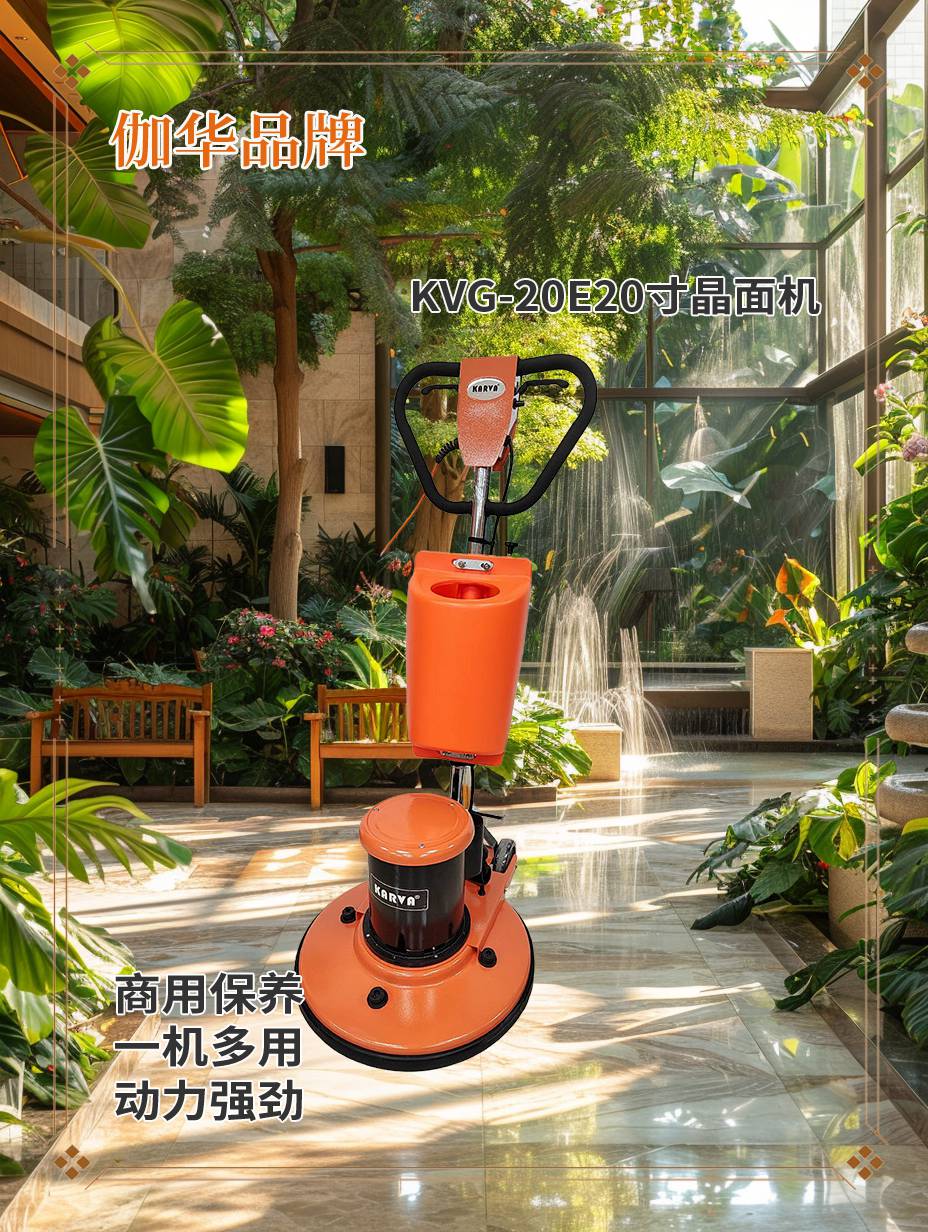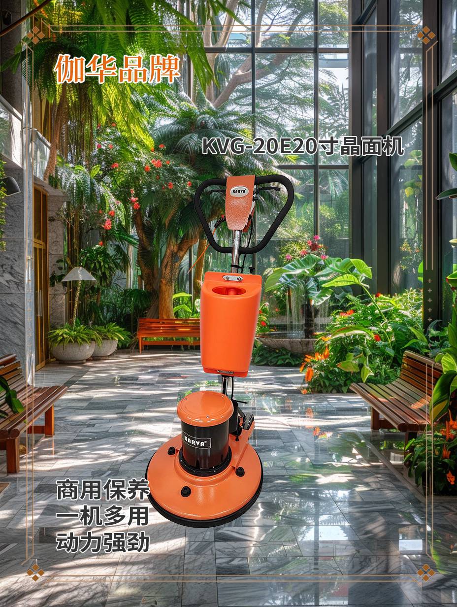 以伽华20寸晶面机KVG-20E为例,这款专为石材晶面抛光保养设计的设备,以其2.5匹大功率电机和175转/分的转速,实现了高效抛光和精准打磨。金属手柄的设计,让操作更加省力,减少了工作人员的疲劳感,尤其适合石材护理公司在商场、酒店、机场等多样复杂环境中使用。此外,13米长的电源线和54公斤的合理重量,确保设备既有充足的动力,又便于现场灵活调度。